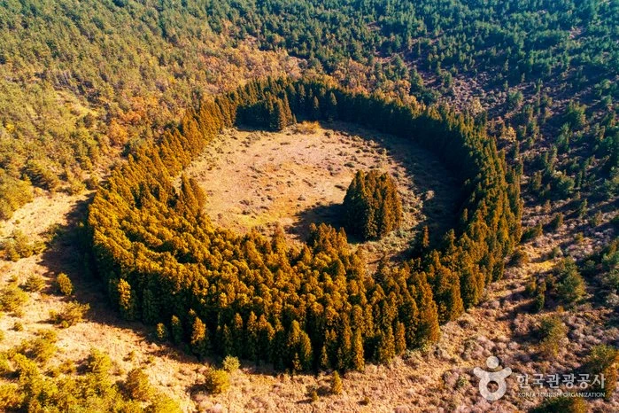 제주도에는 360여 개의 기생화산이 분포되어 있지만 이곳 산굼부리를 제외한 다른 화산은 모두 대접을 엎어놓은 듯한 분화구의 형태이고, 산굼부리 분화구만은 제주도에서 유일하게 용암이나 화산재의 분출없이 폭발이 일어나 그곳에 있던 암석을 날려 그 구멍만이 남게된 것이다. 이러한 화산을 마르(Maar)라고 부르는데 한국에는 하나밖에 없는 세계적으로도 아주 희귀한 화산이다. 자료출처 : 대한민국 구석구석(http://korean.visitkorea.or.kr) 펜션에서 약 14.7km, 차량 약 20분 거리