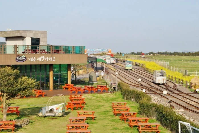 제주레일바이크는 2013년 10월에 오픈한 제주도 최초이자 유일한 레일바이크로 단순관람이 아니라 소, 말이 방목되어 있는 대자연의 목장 초원 위 철로에서 친구, 가족과 함께 바이크를 타며 체험관광을 할 수 있어 학생 뿐만 아니라 일반이용객들도 매우 좋아하는 제주도 유일의 자연 체험형 유원시설이다. 자료출처 : 대한민국 구석구석(http://korean.visitkorea.or.kr) 펜션에서 약 6.1km, 차량 약 10분 거리