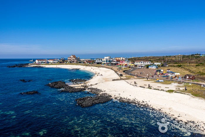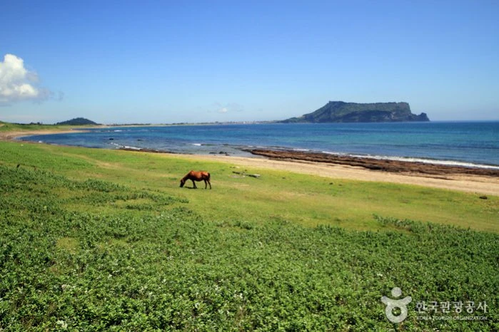 제주에서 가장 제주다운 곳 우도(牛島)는 ‘소가 누워있는 모습과 같다’고 하여 붙여진 이름이다. 남태평양의 휴양지 같은 느낌의 비취빛 바다, 마을 안으로 한걸음 들어가 만나는 알록달록한 낮은 지붕과 제주스런 돌담을 두른 밭들의 풍경은 이국적이면서도 정겹다. 해발 132m, 우도의 백미인 우도봉 정상에 서면 온 섬이 발아래로 보이고 건너편 성산일출봉이 눈에 꽉 찬다. 바다 너머로 크고 작은 오름들이 잔잔한 너울을 그리는 풍경도 일품이다. 자료출처 : 대한민국 구석구석(http://korean.visitkorea.or.kr) 펜션에서 약 24.2km, 차량 약 40분 거리